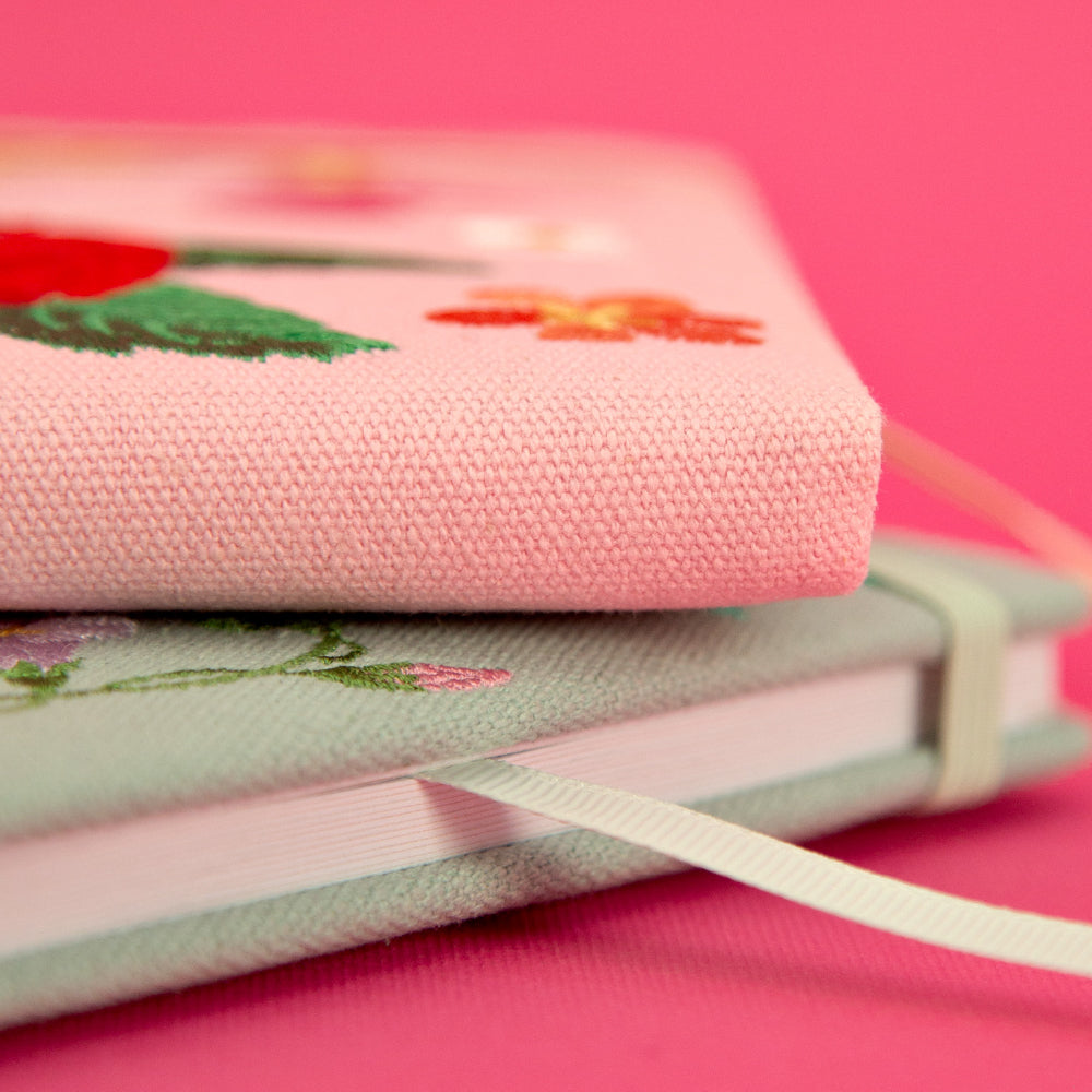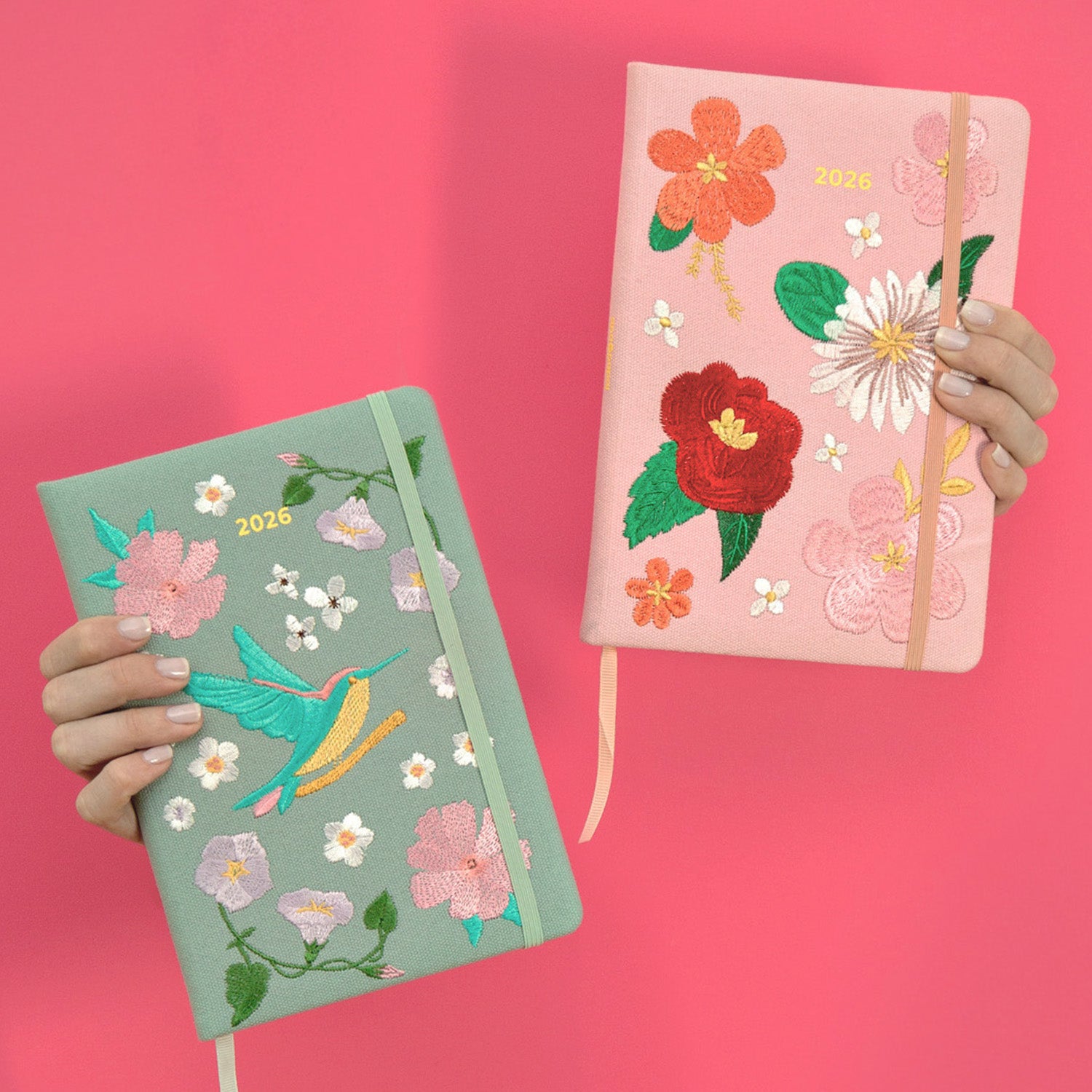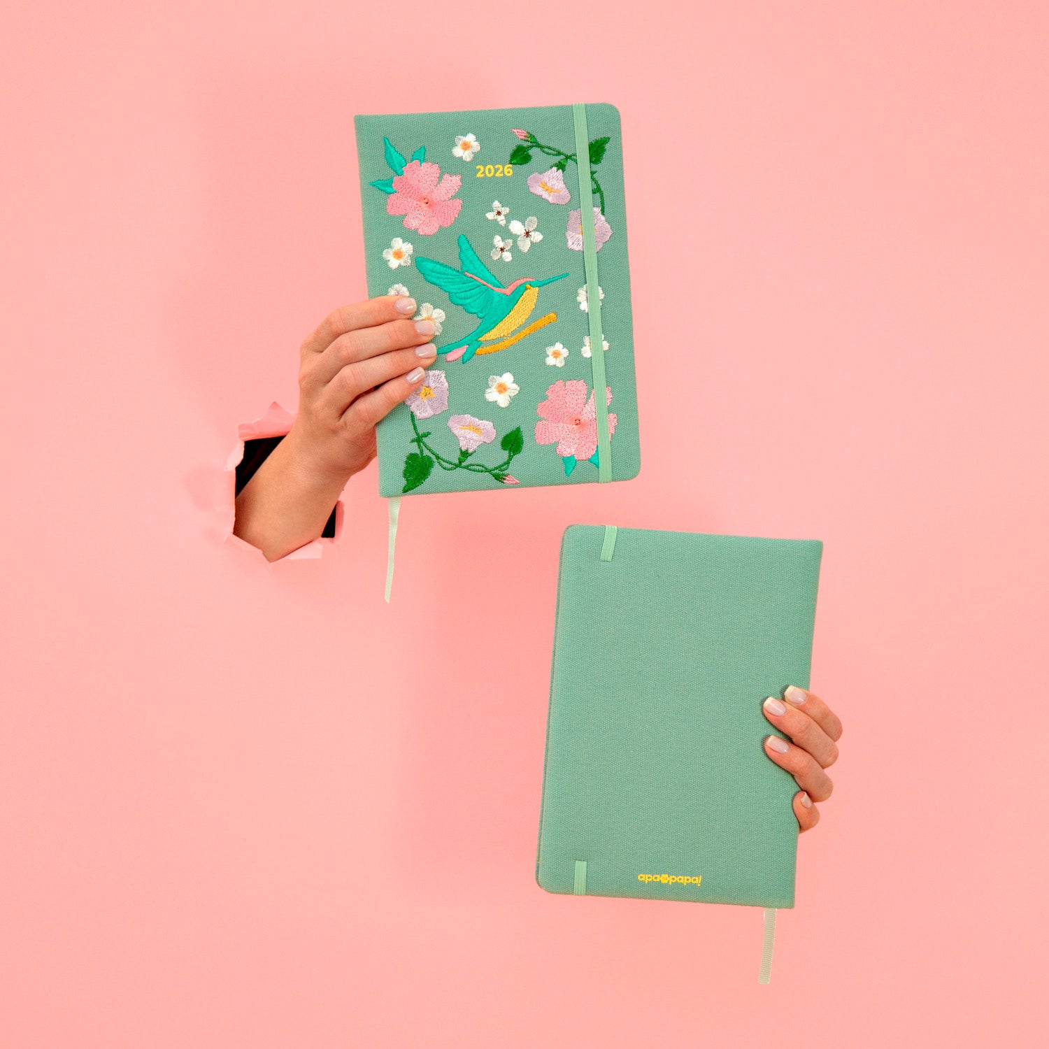 Tapa dura, puntas redondeadas, terminación bordada. Con elástico y cinta señaladora a tono.