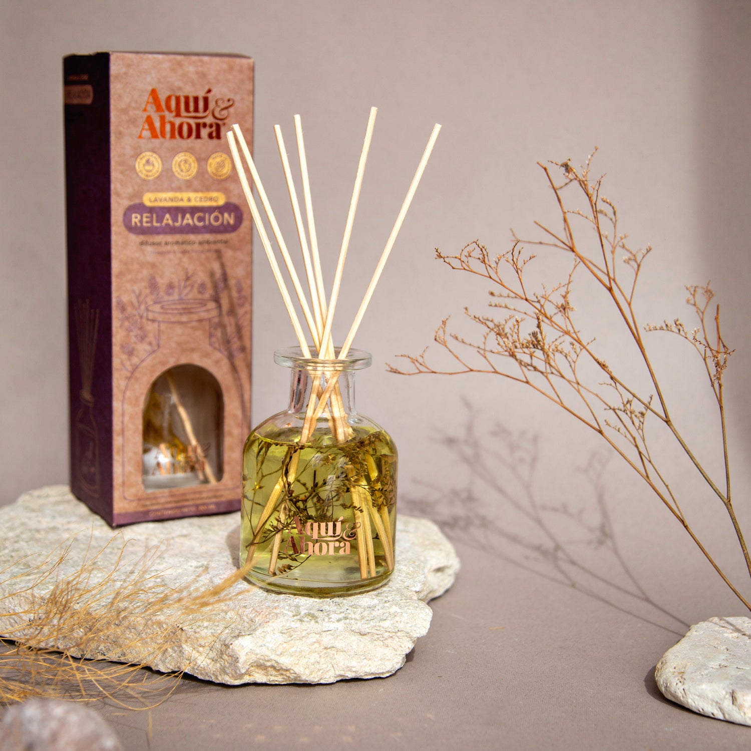 Linea de esencia Premium de Lavanda & Cedro con flores naturales en su interior.