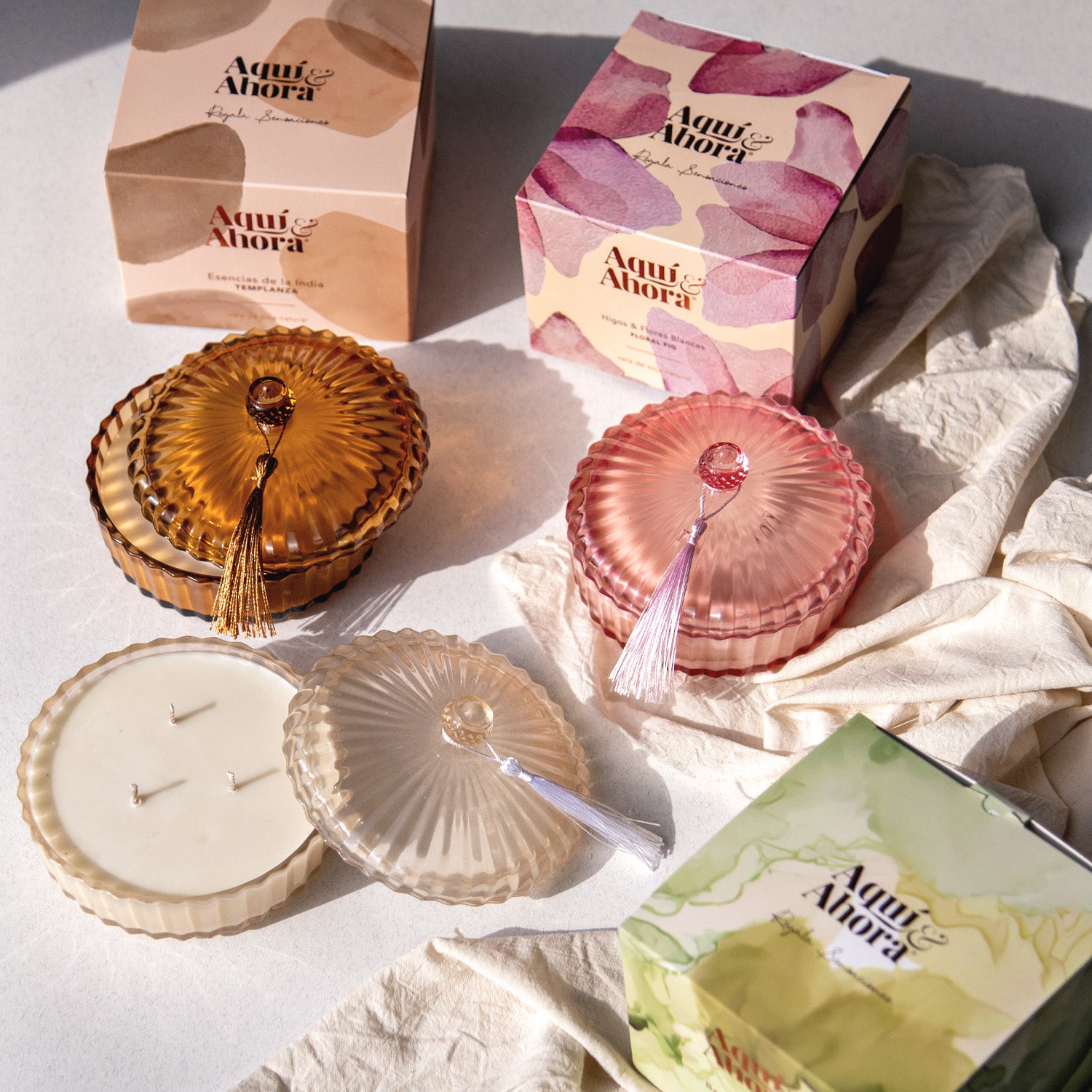 En envase de vidrio, disponible en 3 colores según fragancia.